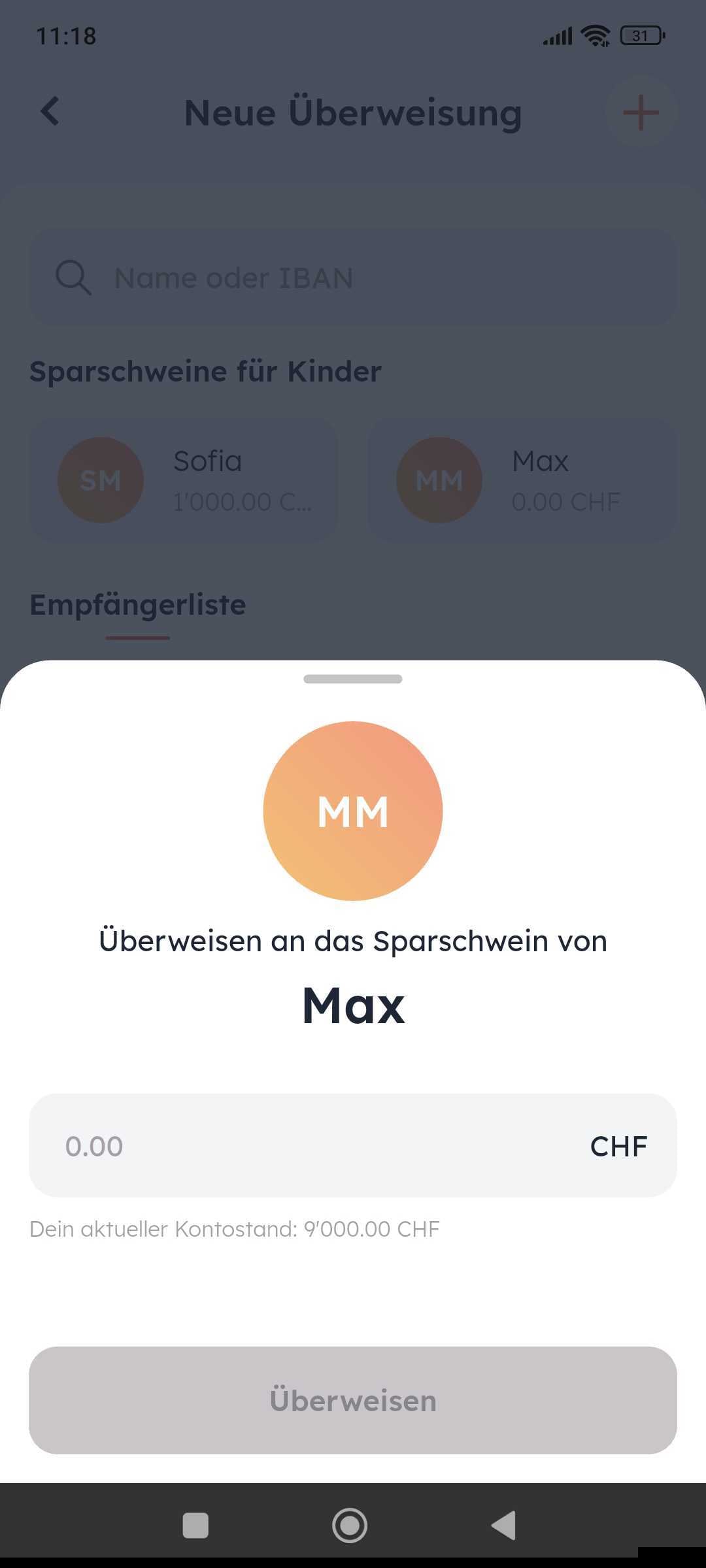 Du wählst einfach das Sparschwein, auf welches du den Betrag X überweisen möchtest. Dann bestätigst du die Transaktion und die Zahlung wird ausgeführt.