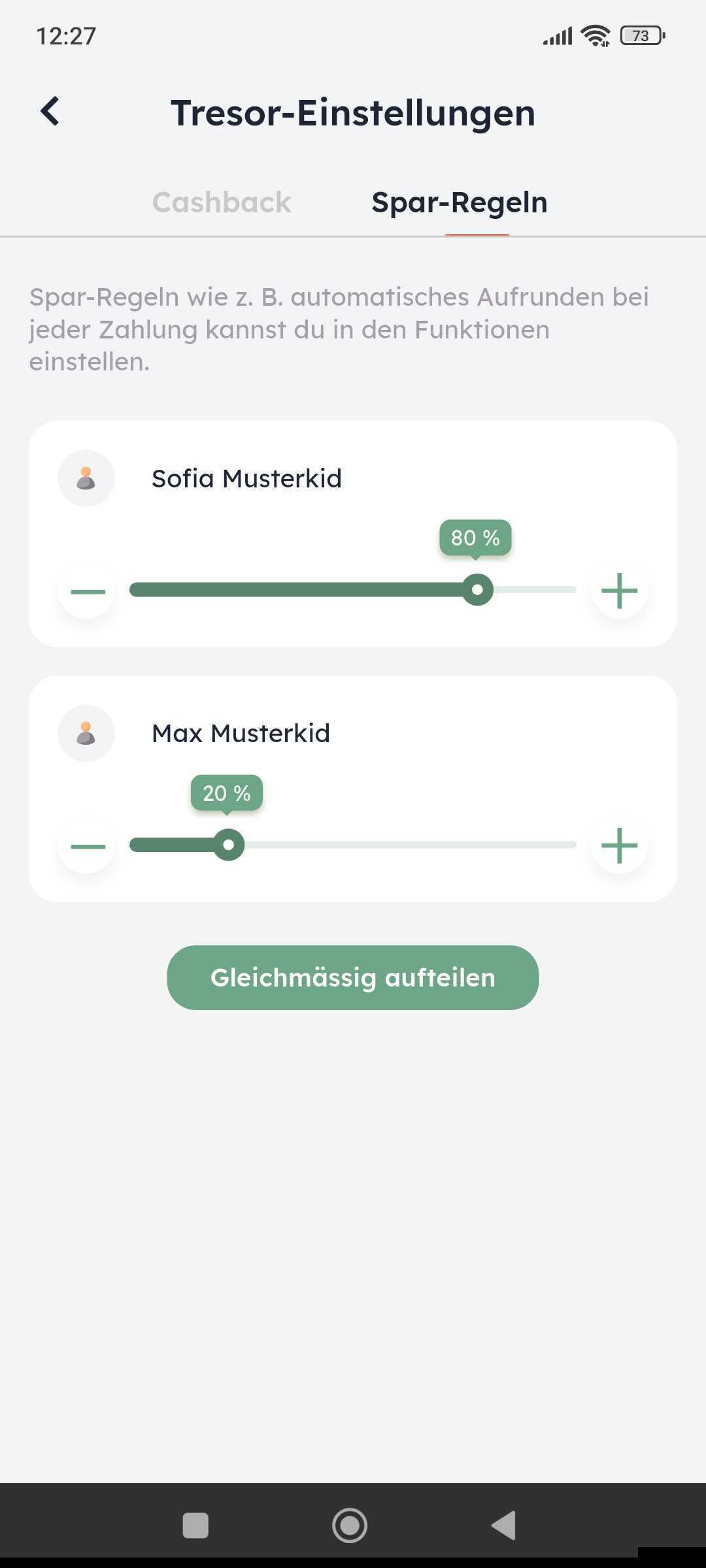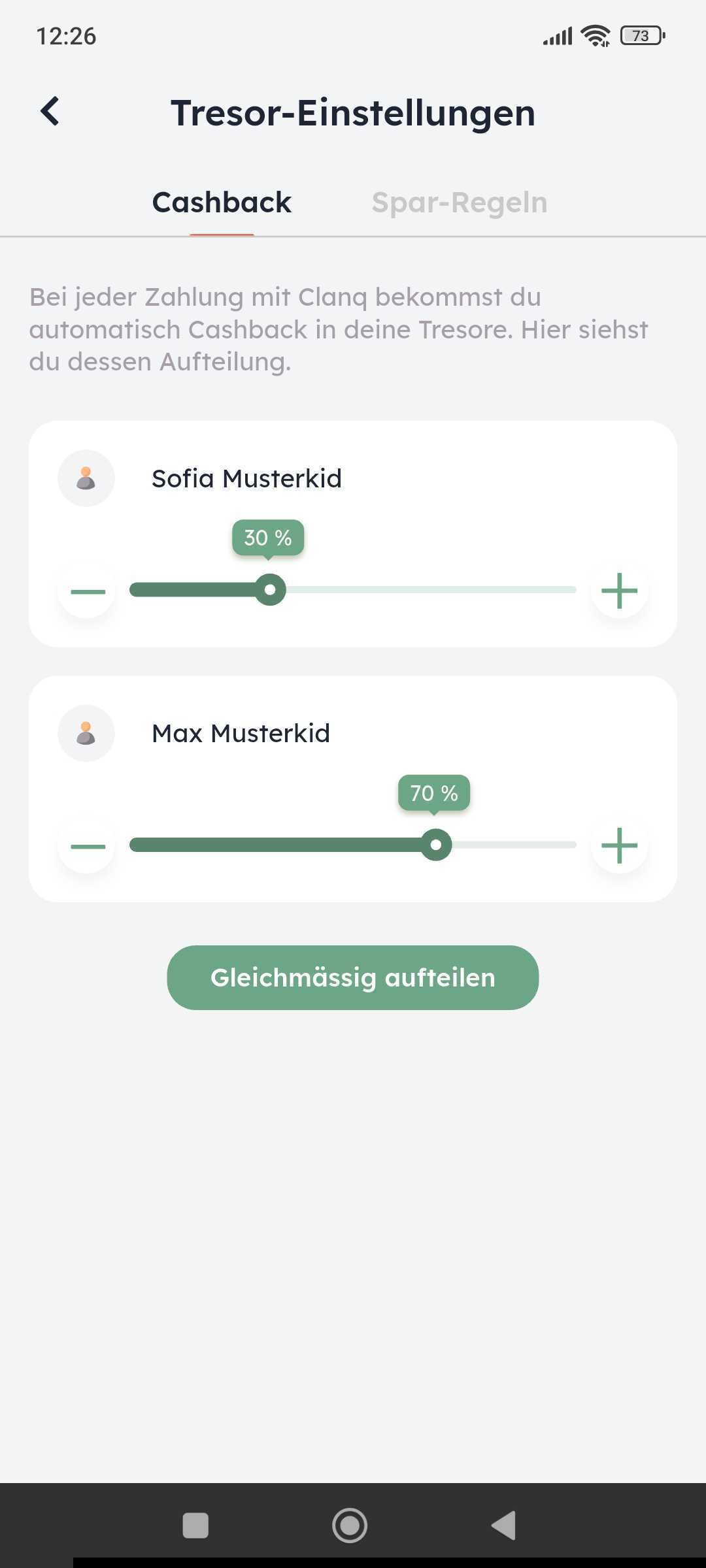 Bei jeder Zahlung mit deiner Clanq Karte bekommst du automatisch Cashback in deine Tresore. Du kannst deinen Cashback für deine Kinder aufteilen und den Prozentsatz selbst definieren.