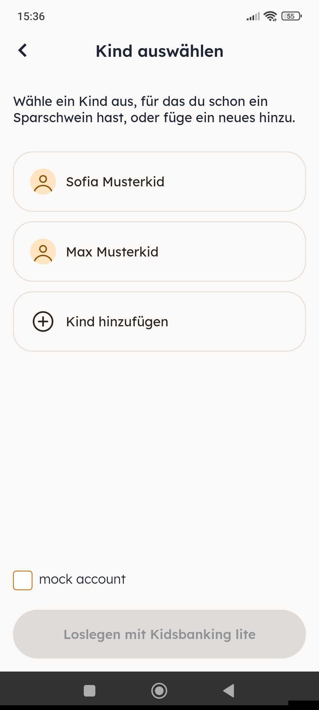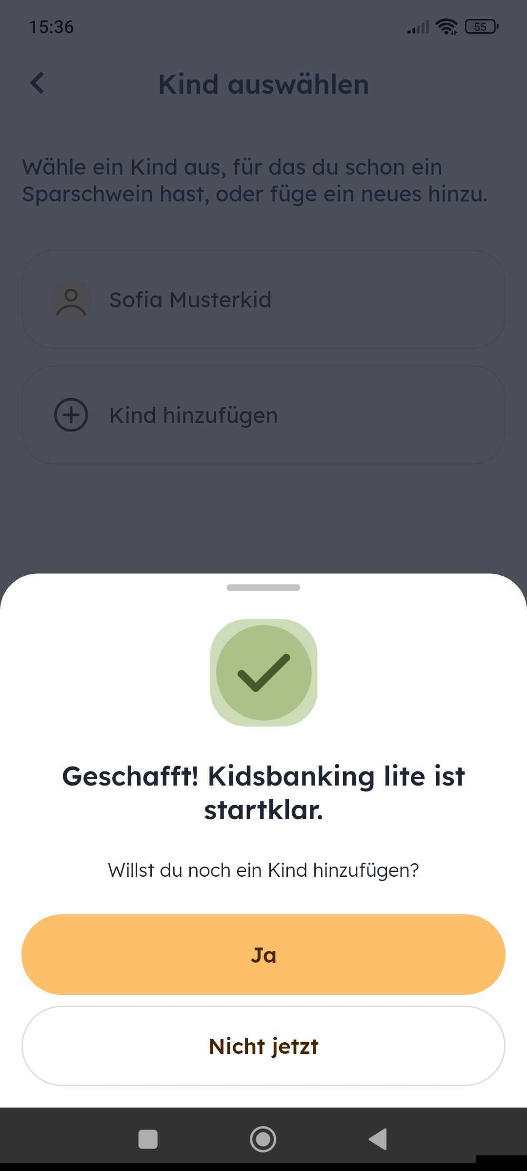 Hier kannst du ein Kind auswählen, für das du schon ein Sparschwein eröffnet hast oder füge ein neues Kind hinzu.