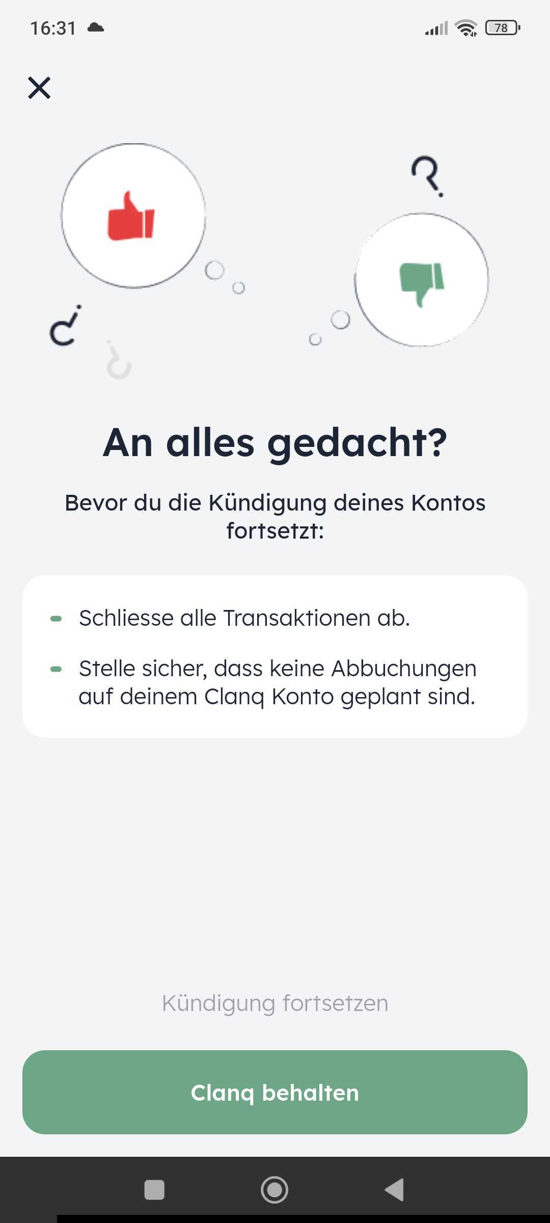 Mit Tippen auf „Konto kündigen” ist dein Clanq Konto im Handumdrehen gekündigt. Sobald der Kündigungsprozess abgeschlossen ist, erhältst du eine Benachrichtigung von uns. Dies dauert für gewöhnlich 1-2 Wochen.