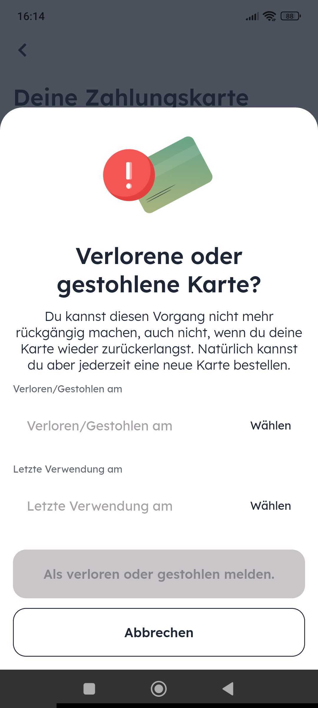 Hast du deine Karte verloren, kannst du das direkt über die App melden. Dabei wird verlangt, dass du einen Grund angibst, welche aus einer Liste gewählt werden kann. Hast du den Vorfall erfolgreich gemeldet, wird deine Karte sofort gefroren und du hast zwei Optionen:
