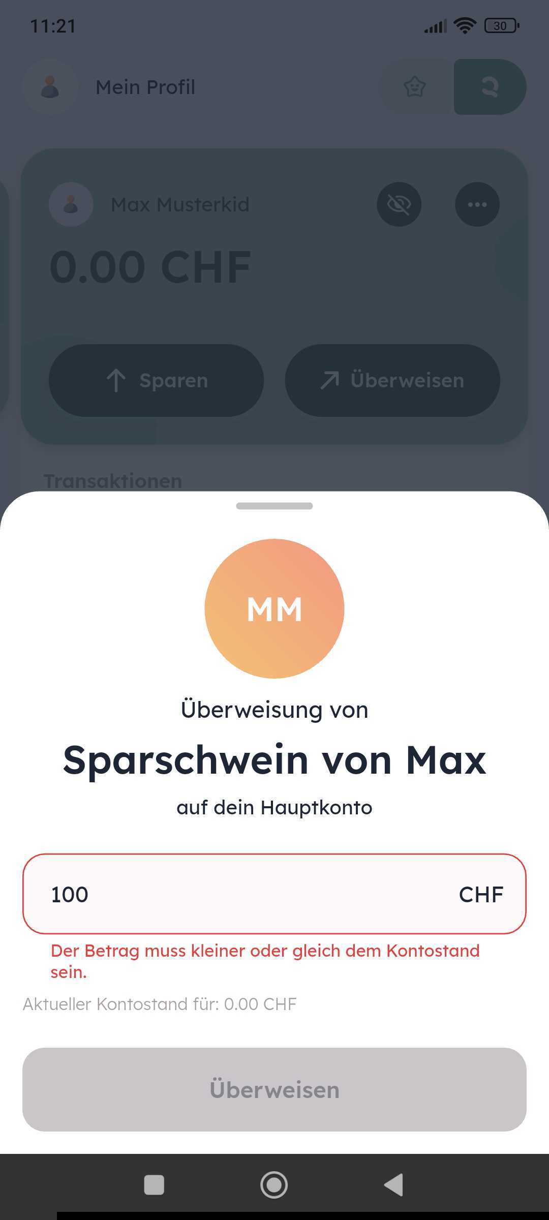 Du kannst von dem Sparschwein nicht mehr überweisen, als drauf ist. Der Betrag soll kleiner oder gleich sein.
