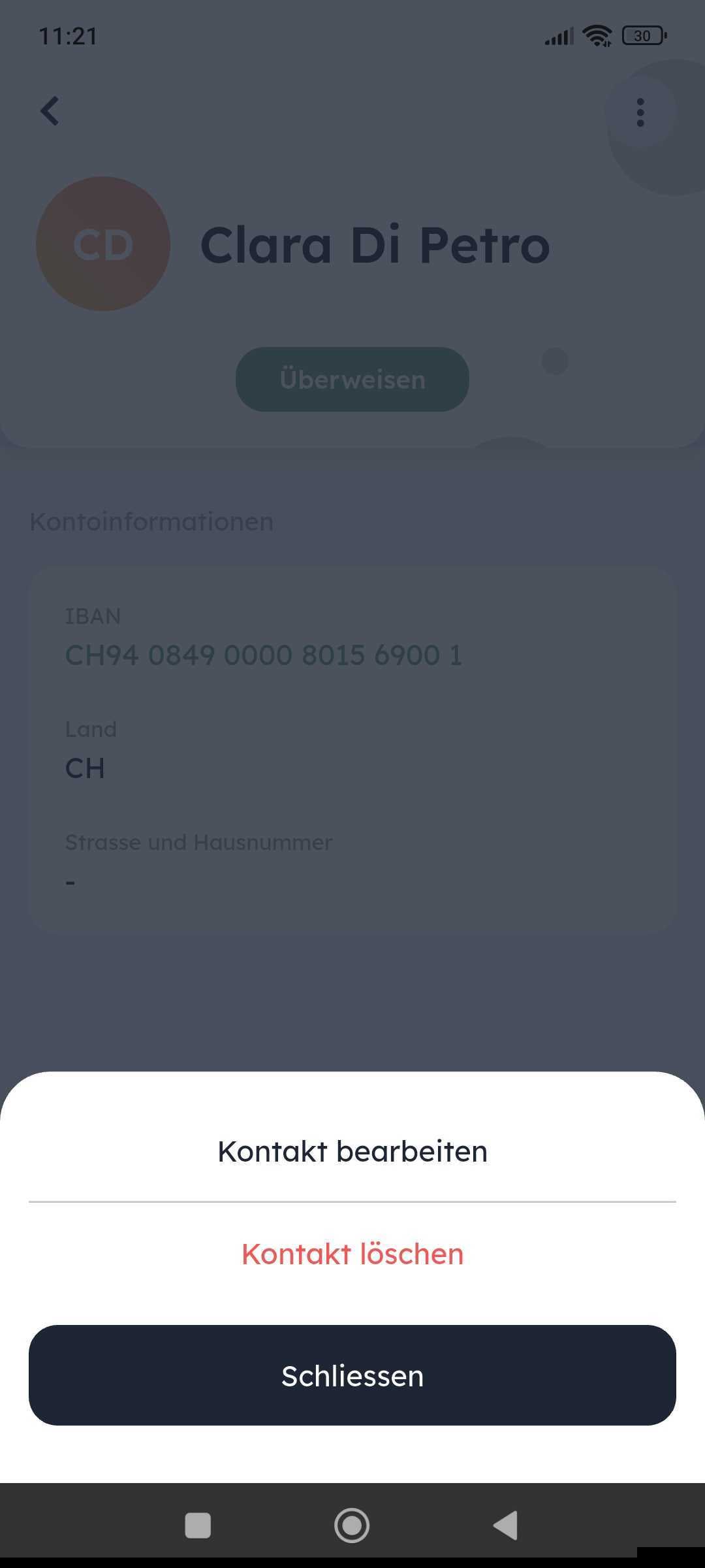 In deiner Empfängerliste kannst du Kontodaten & Transaktionen eines Emfängers ansehen. Wähle einen Empfänger, wishe nach links und klicke auf "Details anzeigen". Du wirst zur Übersicht des Kontakts weitergeleitet.