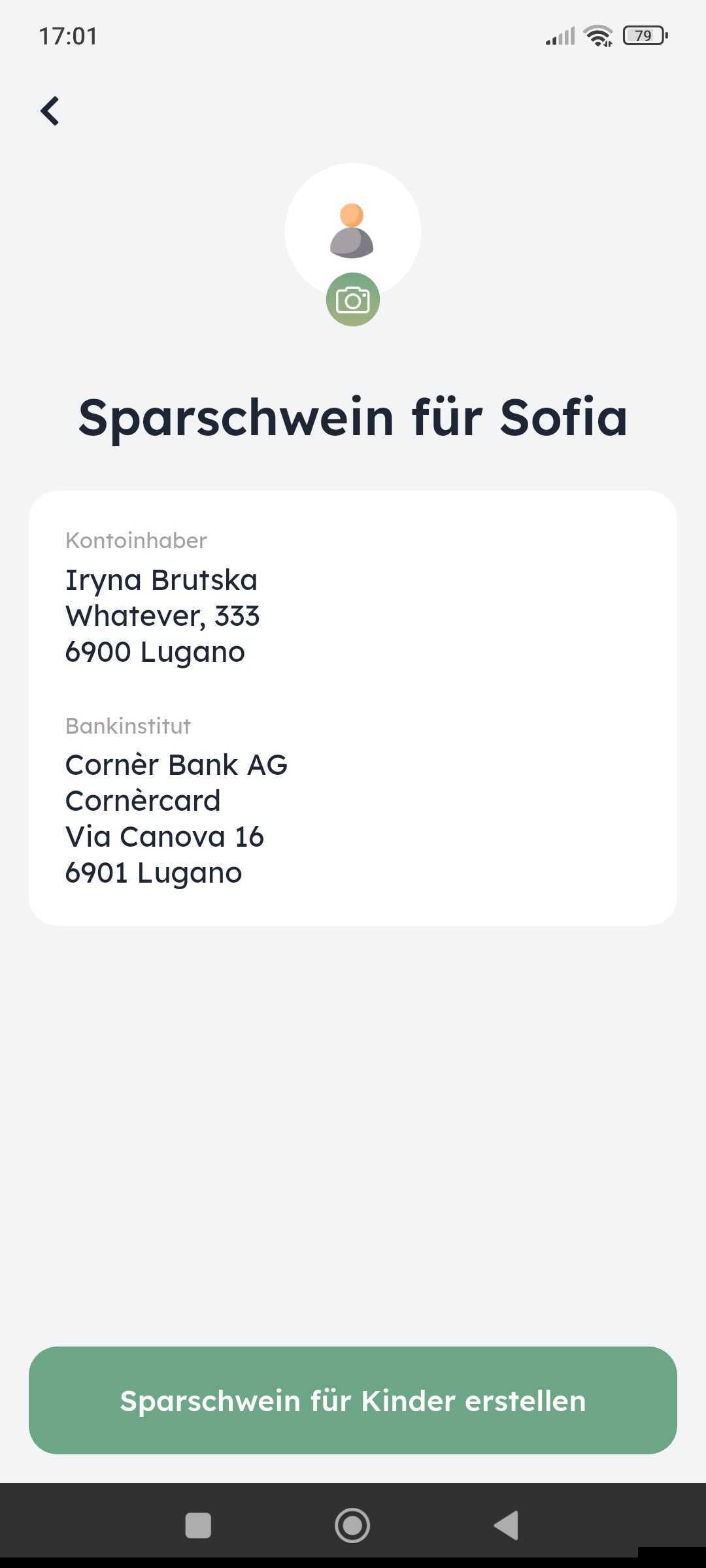 Schliesslich kriegst du die Kontodaten des neuen Sparschweins auf deinen Bildschirm.