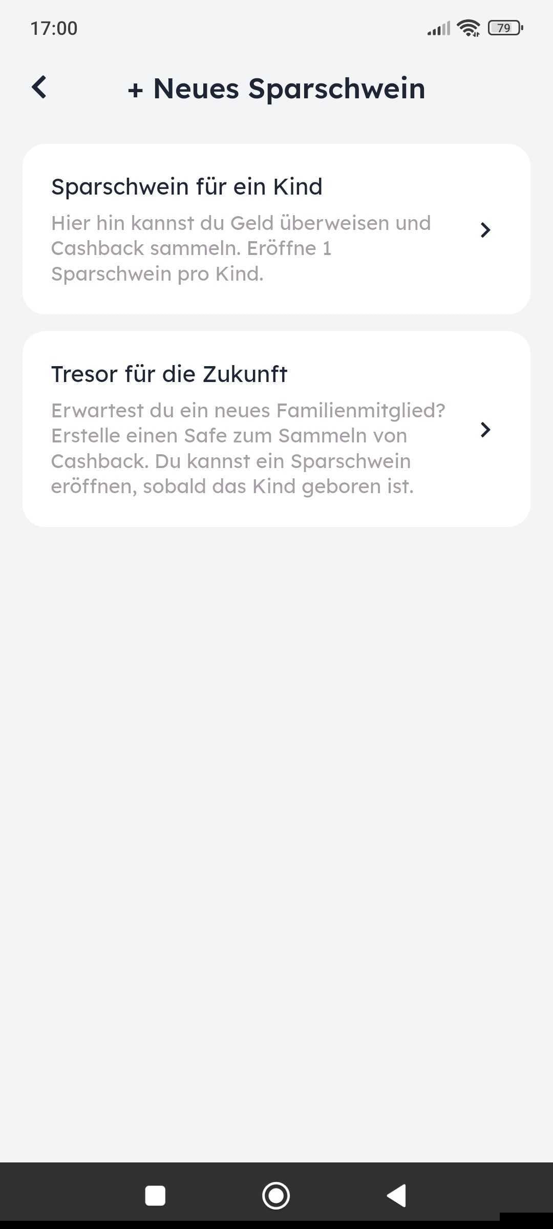 Öffne die Clanq App und wische mit 2 Fingern nach rechts, um das Schnellmenü zu öffnen. Hier tippst du auf „+ Neues Sparschwein für Kinder”.