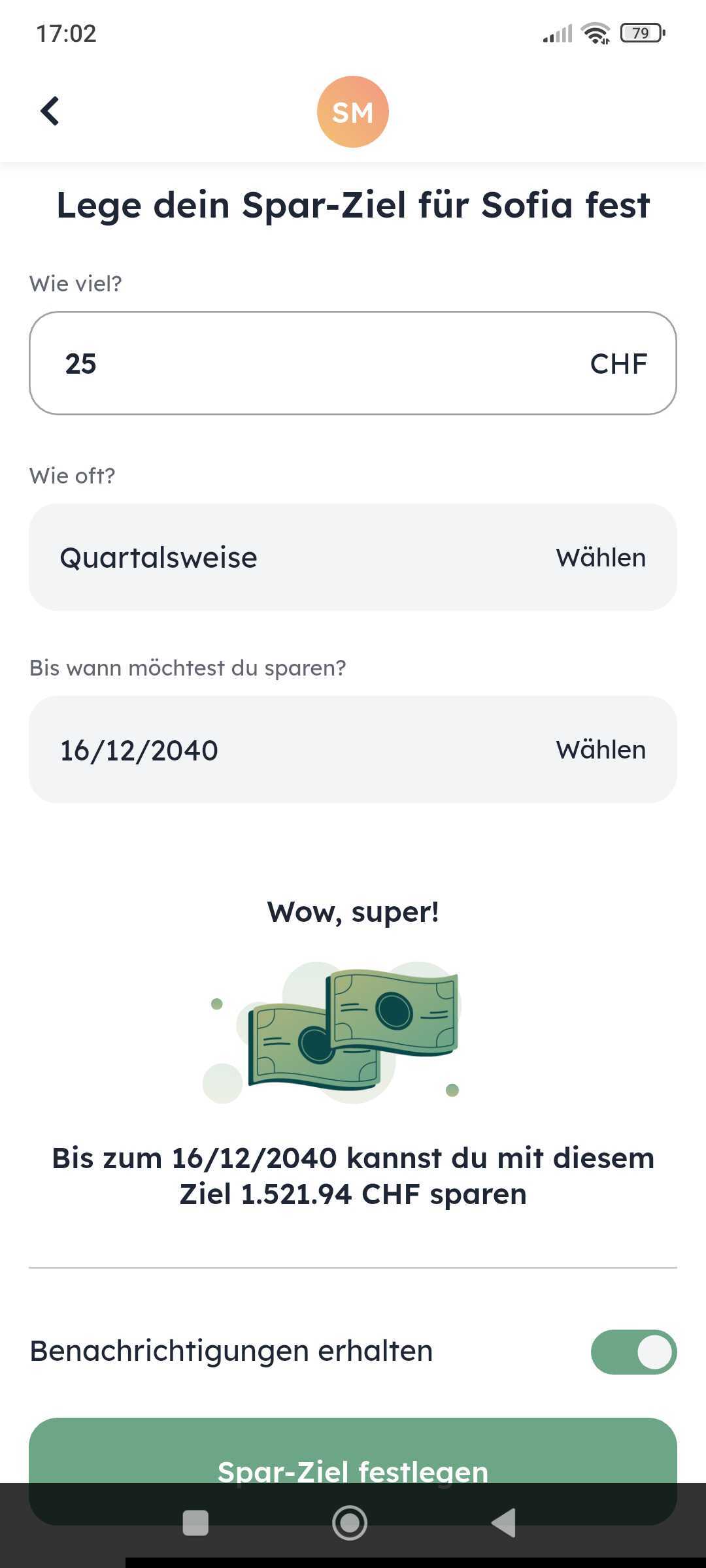 Wähle einen Betrag und ein Intervall (wöchentlich, monatlich oder quartalsweise) aus und gib ein Datum ein, bis wann du das Ziel erreichen möchtest (z. B. das Datum, an dem dein Kind 18 Jahre alt wird). Du bekommst sofort angezeigt, wie viel du mit diesen Zielen bis zu diesem Datum zusammenbekommst.