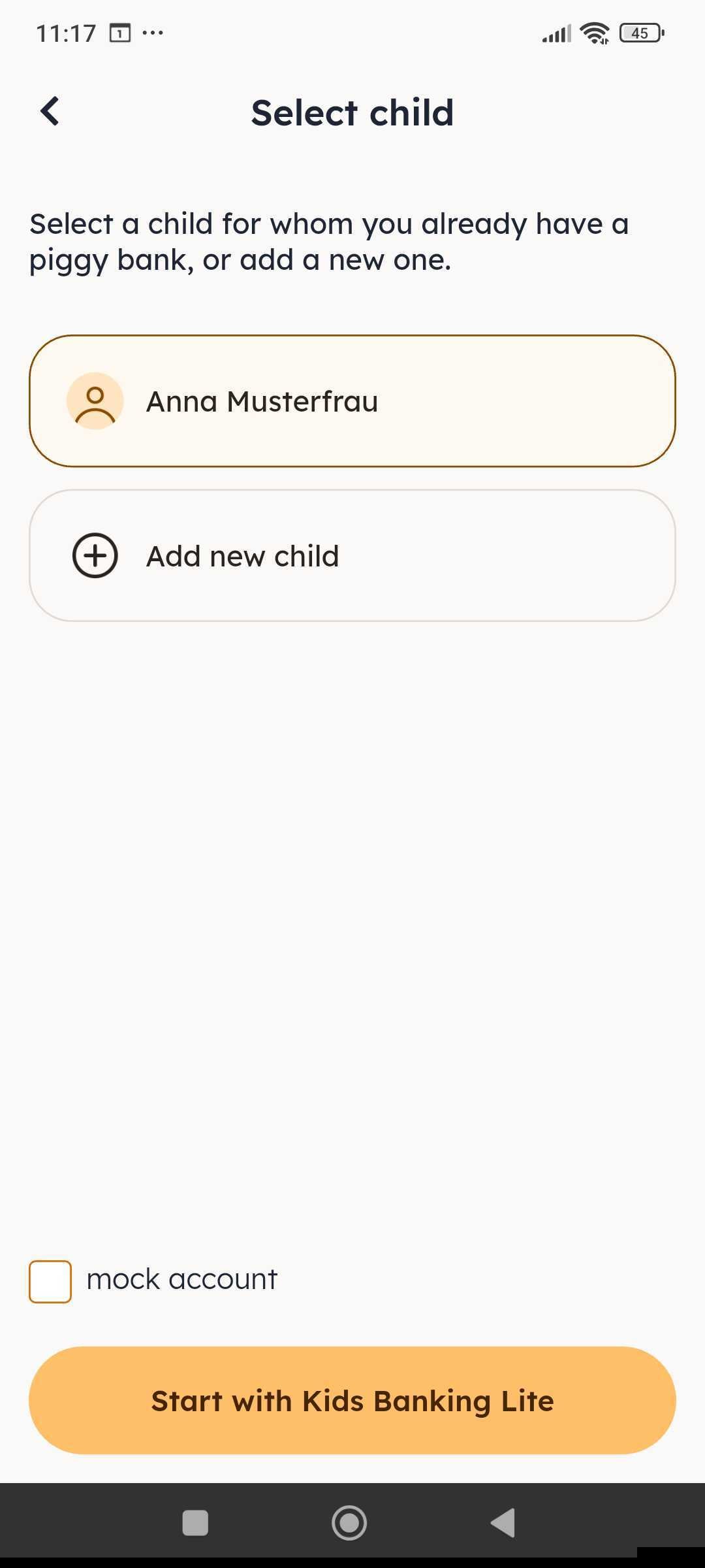 Here you can select a child you’ve already created a piggybank for or add a new child.