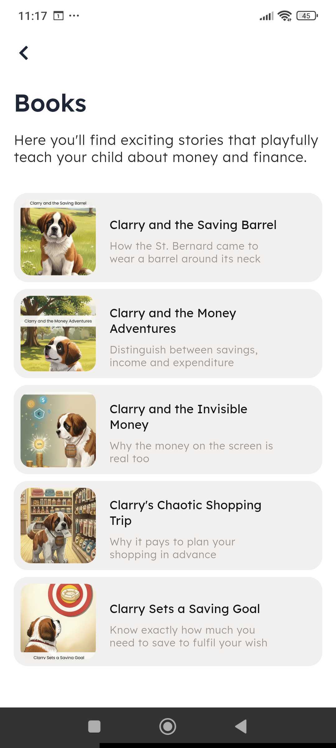 In the “Learning” feature, you'll find the e-books with playful stories where Clarry learns how to handle money.