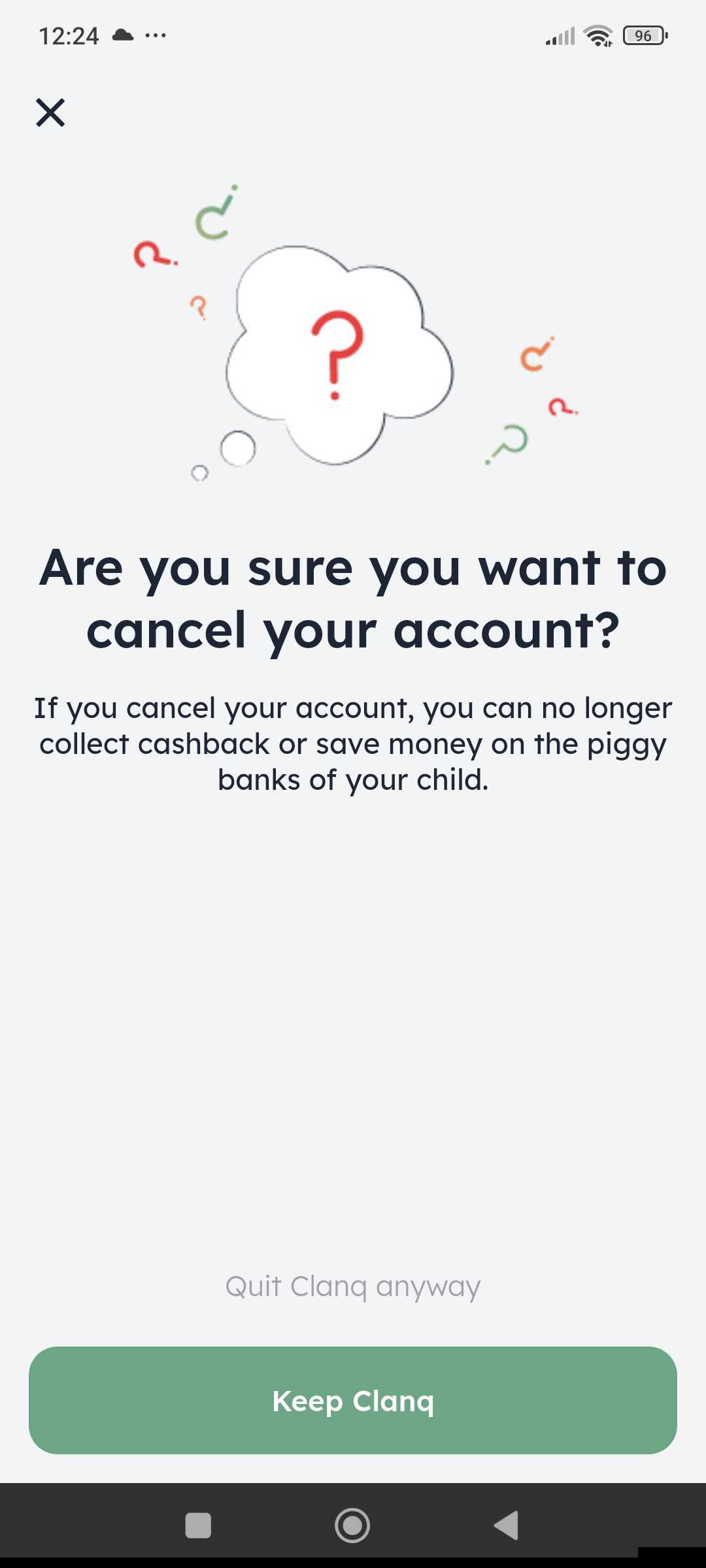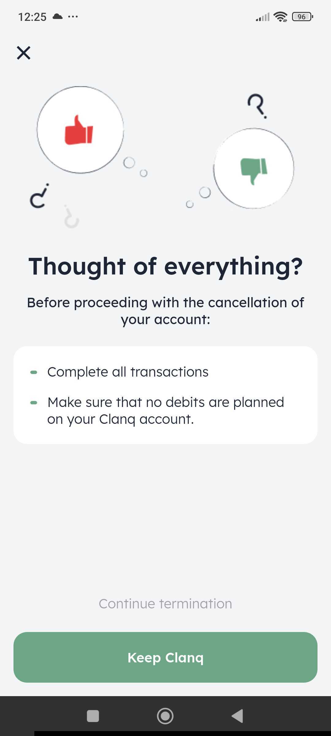 By tapping on "Close account", your Clanq account will be cancelled in no time at all. As soon as the cancellation process is complete, you will receive a notification from us. This usually takes 1-2 weeks.