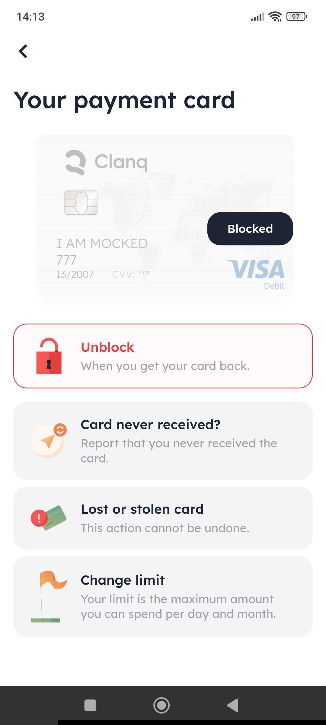 You can carry out this action at any time by pressing the "Block" button. You can also unblock your card yourself at any time by pressing the same button.