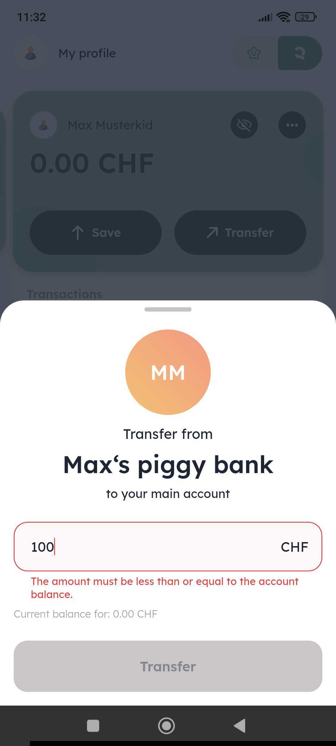 You cannot transfer more money from your piggy bank than you have in it. The amount must be less than or equal to the balance.