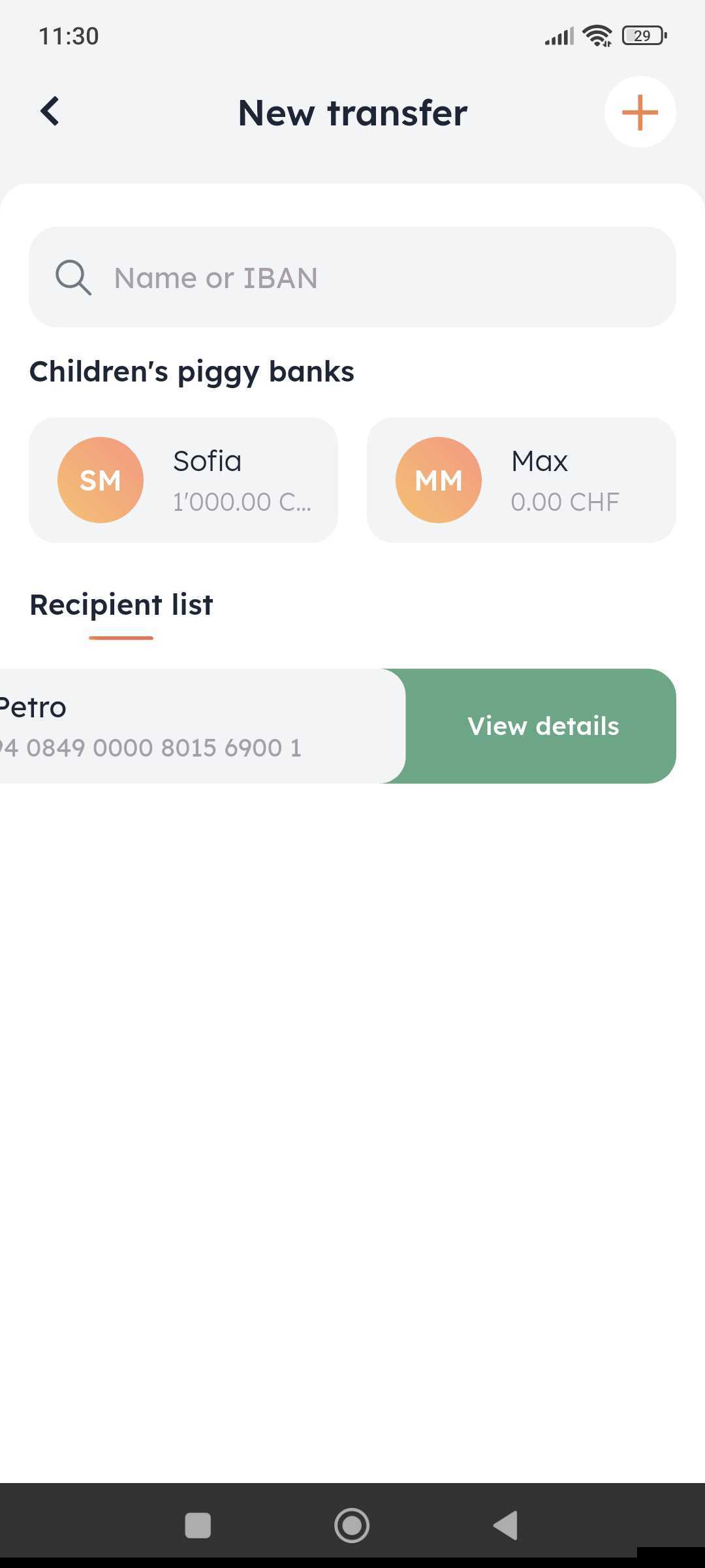 You can view a recipient's account details & transactions in your recipient list. Select a recipient, swipe left and click on "Show details". You will be redirected to the contact's overview.