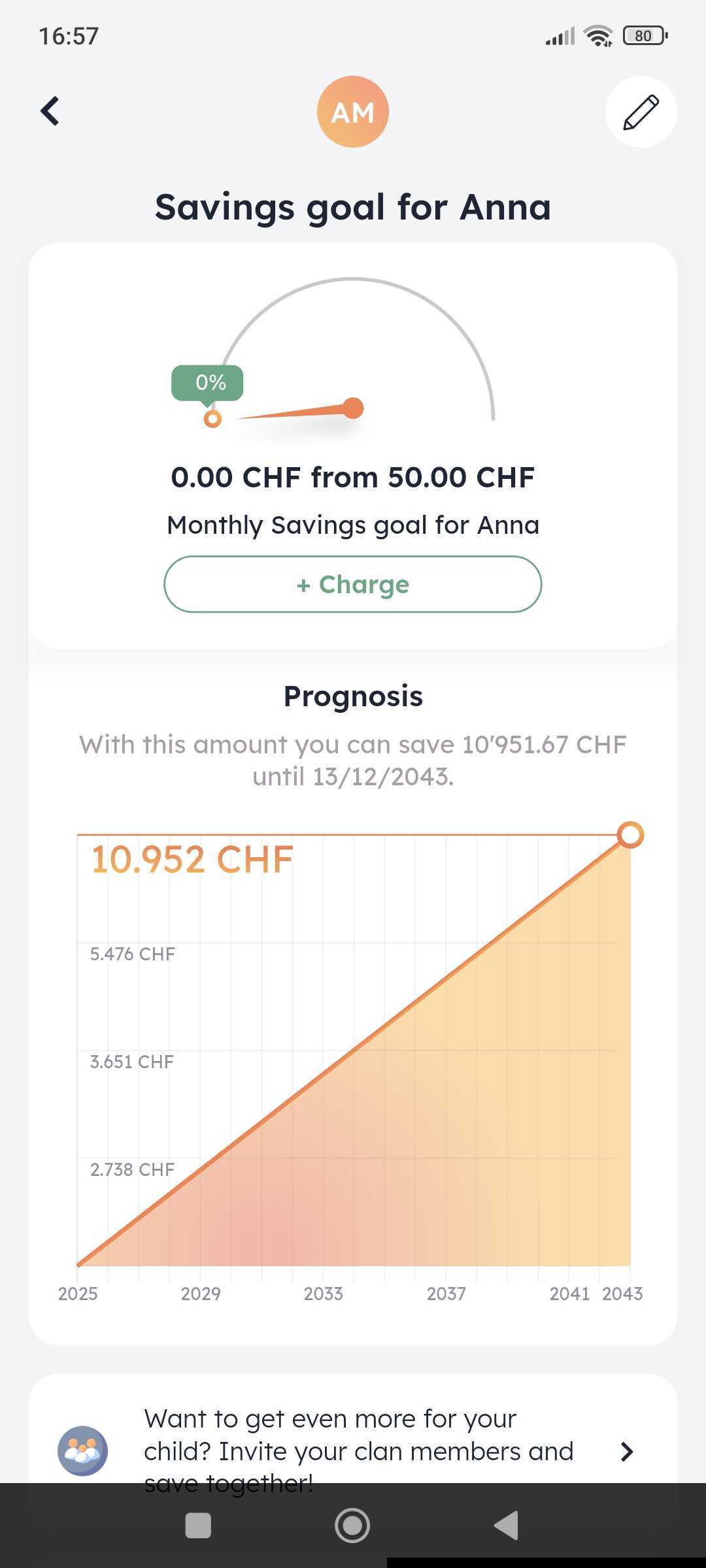 Select an amount and an interval (weekly, monthly or quarterly) and enter a date by when you want to reach the goal (e.g. the date your child turns 18). You will immediately see how much you can achieve with these goals by this date.
