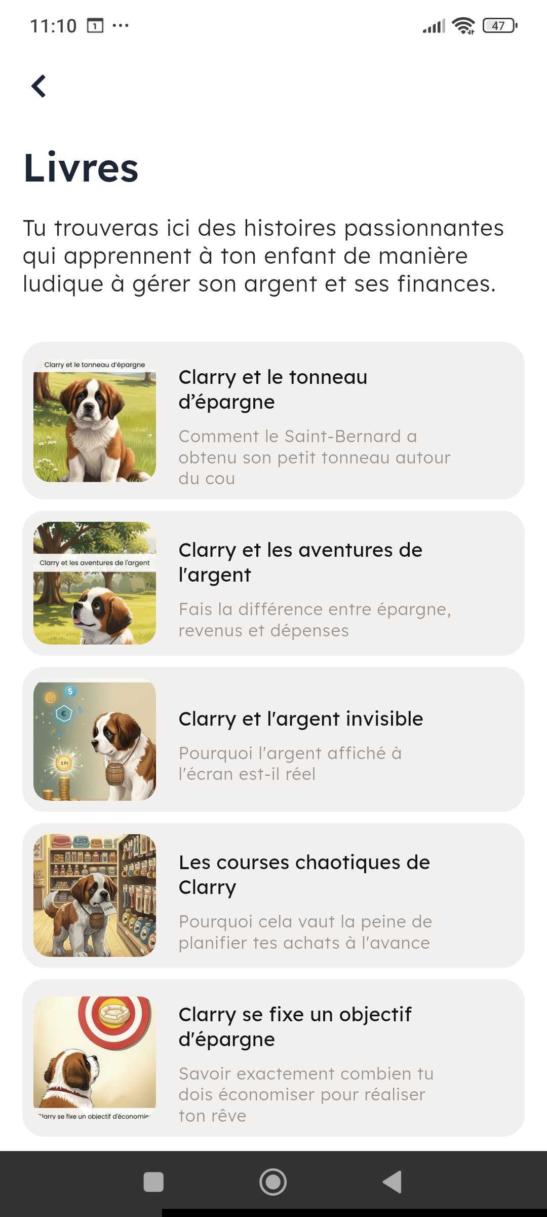 Dans la fonction « Éducation » tu trouves les e-books avec des histoires ludiques, où Clarry apprend à gérer son argent.