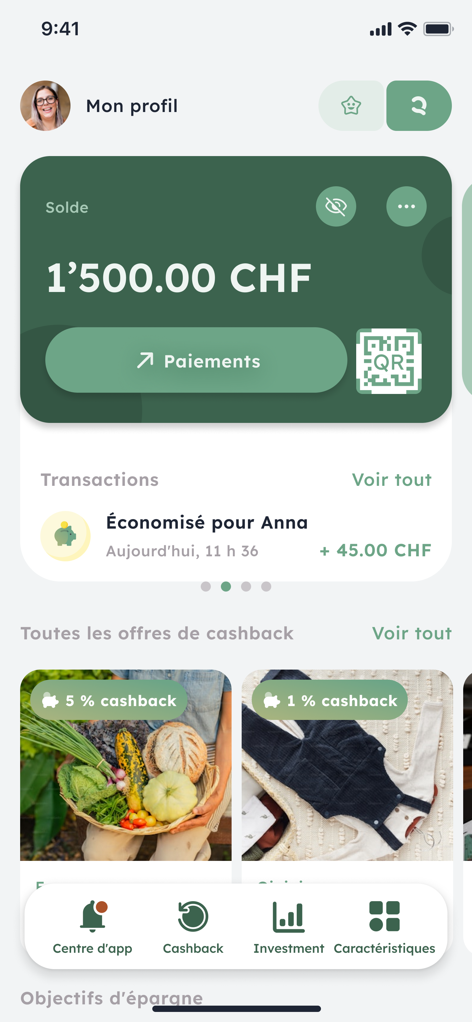 Sur l’écran d’accueil, tu vois un QR-code à côté du champ « Paiements ».