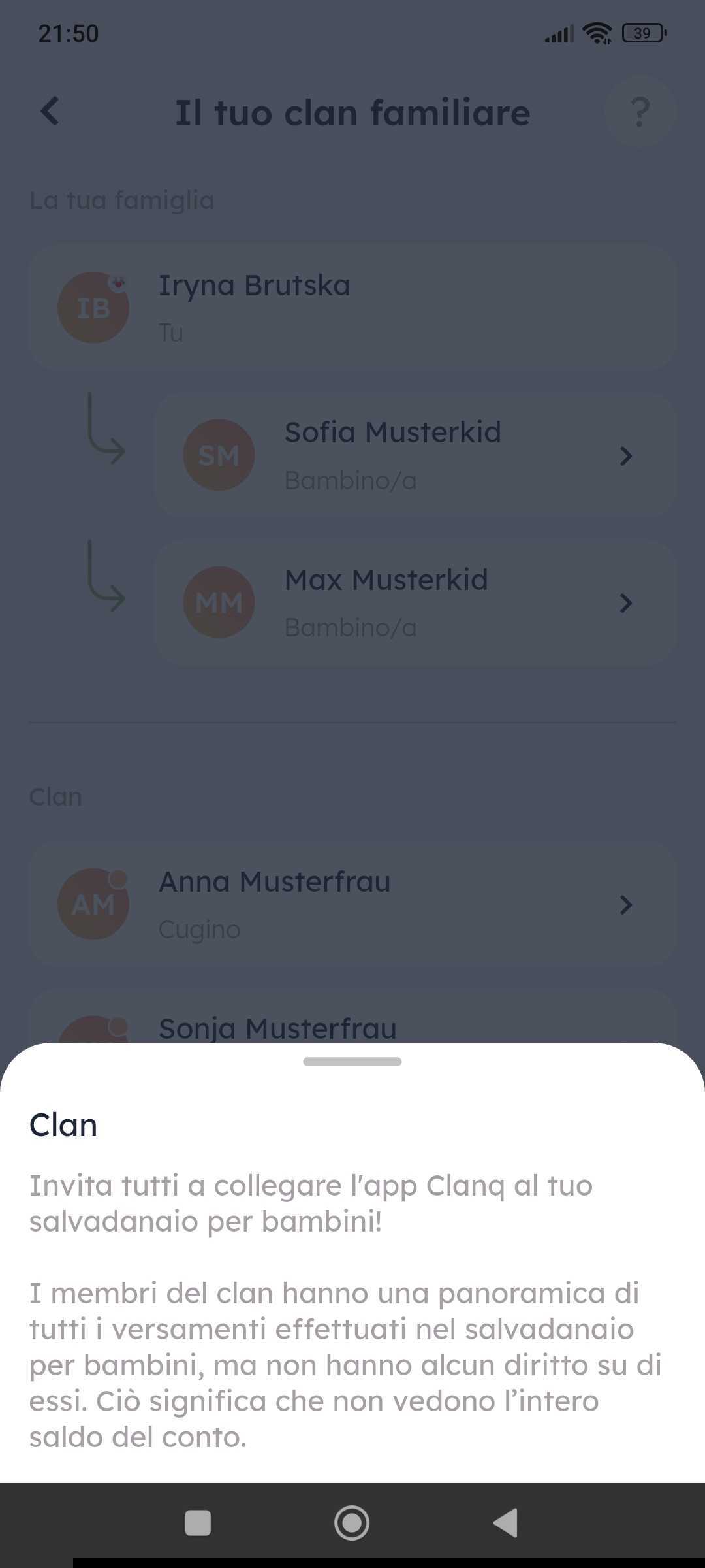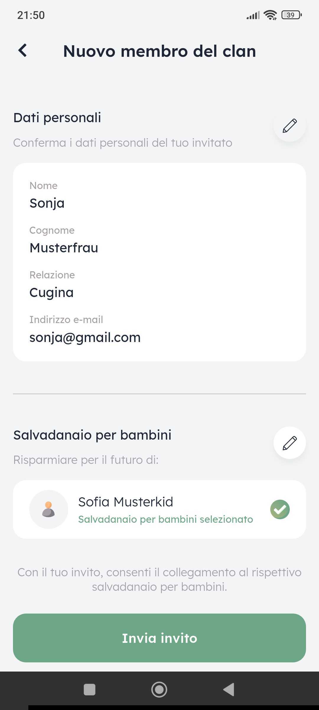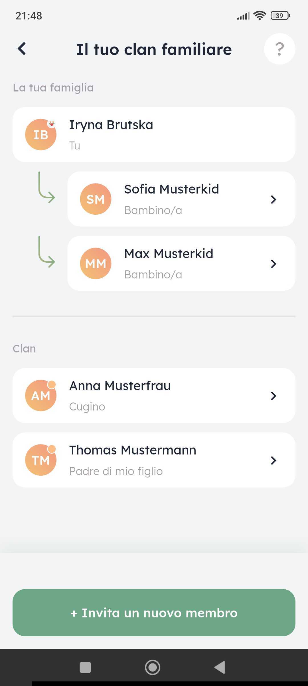 Tocca su “La mia famiglia” nelle funzioni. Qui puoi invitare quanti membri vuoi nel tuo Clan o nella tua famiglia stretta. La persona invitata riceverà una notifica via email e potrà accettare il tuo invito.