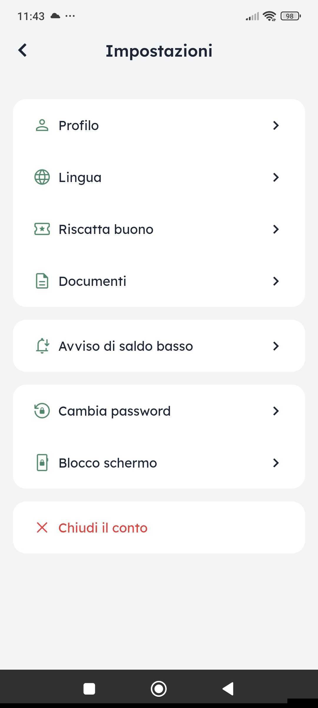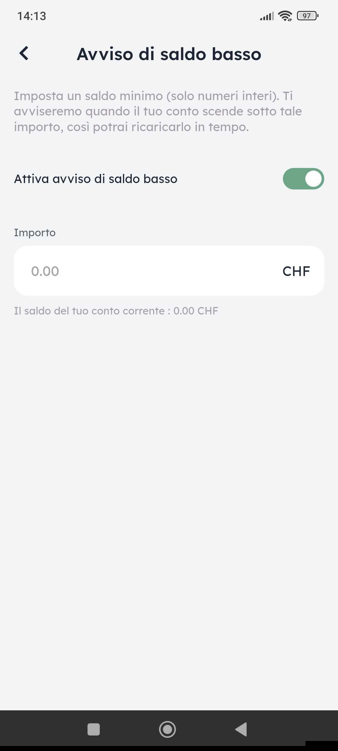 Nelle impostazioni del tuo account imposta l’importo che non vuoi scendere sotto. Ti ricordiamo per tempo tramite notifiche push sul tuo telefonodi ricaricare il tuo conto Clanq.