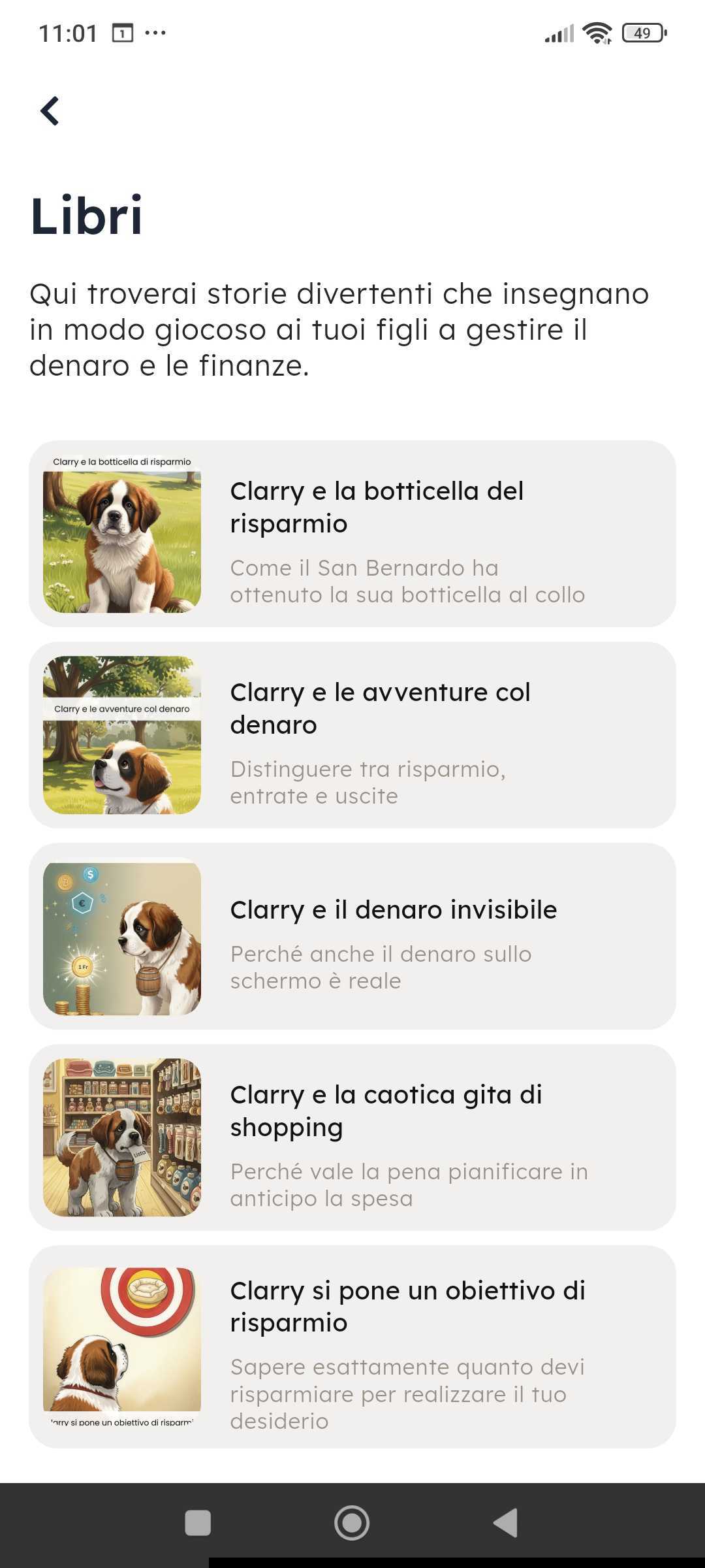 Nella funzione “Educazione” trovi gli e-book con storie giocose, in cui Clarry impara a gestire i soldi.