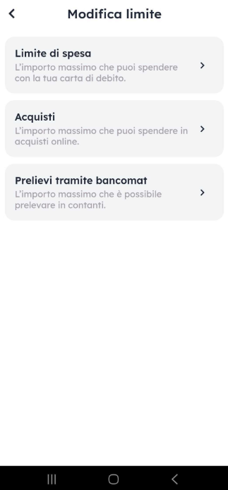 Puoi impostare dei limiti individuali per la tua carta di pagamento in modo da avere sempre denaro a sufficienza sul tuo conto. Pensa al tuo budget e a quali importi hanno senso per te. Puoi impostare i limiti di spesa della tua carta Clanq e i limiti di prelievo dal bancomat. Basta cliccare sul simbolo della carta nella parte inferiore dell'applicazione e modificare i limiti.