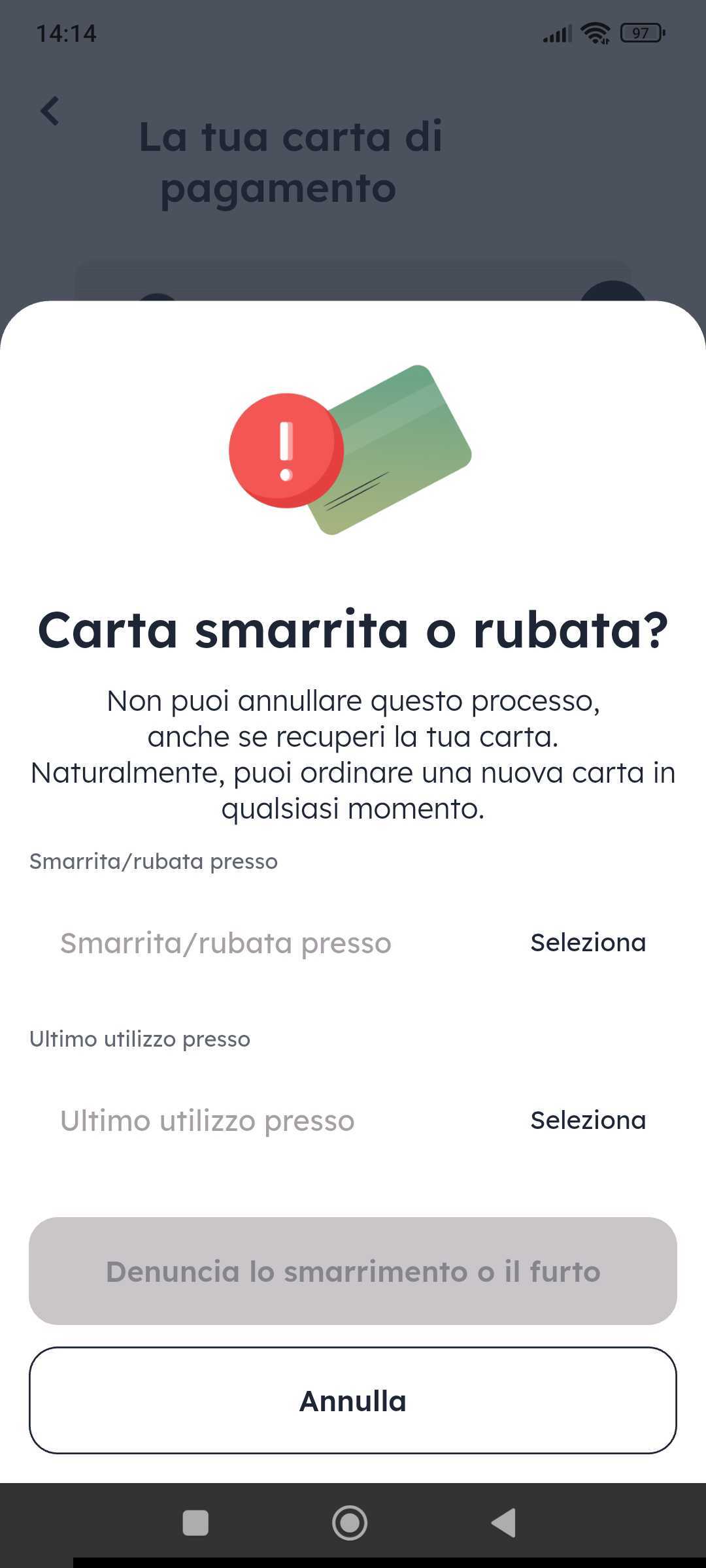 Se hai perso la tua carta, puoi segnalarlo direttamente tramite l'app. Ti verrà chiesto di indicare un motivo, che potrà essere selezionato tramite un elenco. Se la segnalazione è andata a buon fine, la tua carta verrà immediatamente congelata e avrai due opzioni: