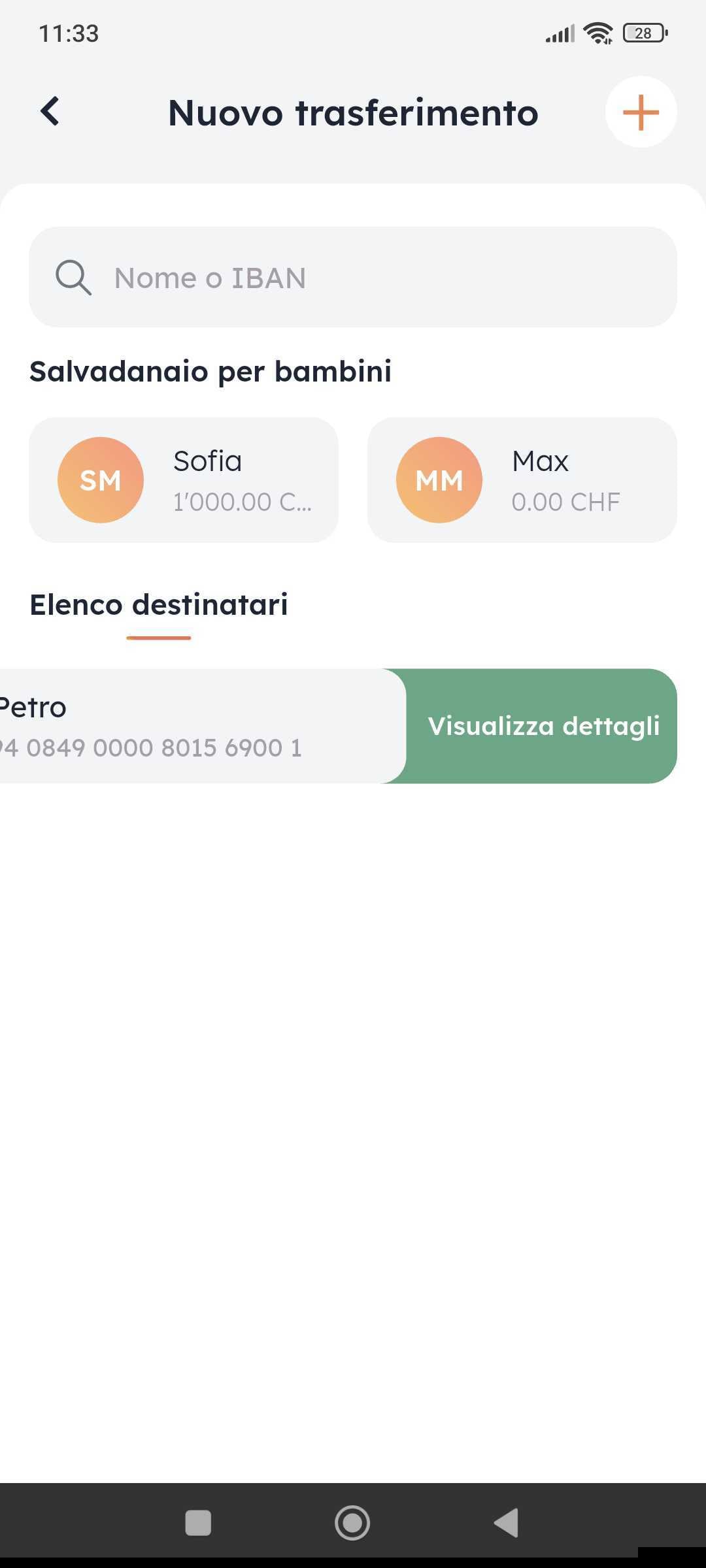 Puoi visualizzare i dettagli del conto e le transazioni di un destinatario nell'elenco dei destinatari. Selezionare un destinatario, scorrere il dito verso sinistra e fare clic su “Visualizza dettagli”. Verrai reindirizzato alla panoramica del contatto.